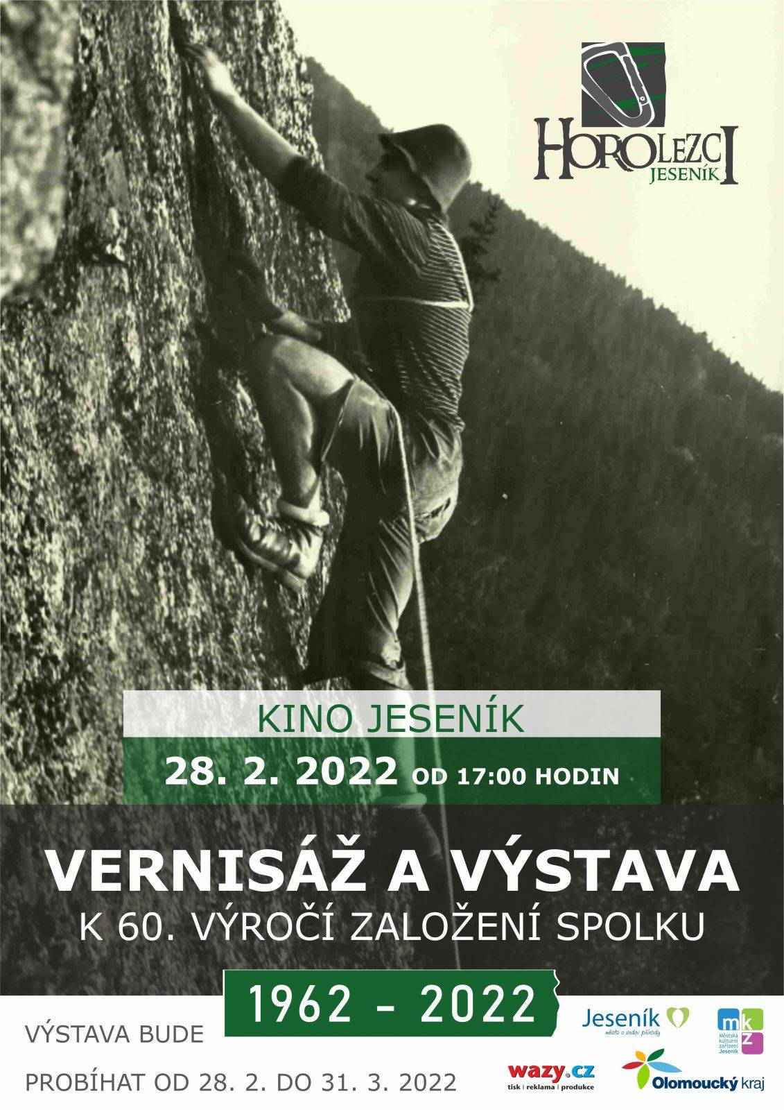 Vernisáž výstavy 60 let HOROLEZCI Jeseník 28.02.2022 - 31.03.2022 V letošním roce tomu je 60 let, kdy 8. ledna roku 1962 vznikl v Jeseníku horolezecký oddíl pod Tělovýchovnou jednotou Jiskra Jeseník. Od té doby mají jeho členové mnoho významných výstupů v horách, na skalách a několik z nich bylo také součástí reprezentačního týmu České republiky ve sportovním lezení. Nedílnou součástí fungování spolku HOROLEZCI Jeseník je pořádání horolezeckých akcí a závodů. Ke svému výročí pořádají zdejší horolezci výstavu fotografií zachycujících celé období jejich činnosti a to v jesenickém kině od 28. 2. 2022, kdy se uskuteční i vernisáž od 17:00 hodin. | |