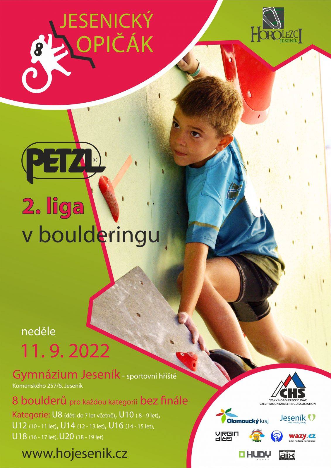 Jesenický opičák 2022 11.09.2022 - Petzl 2. liga v boulderingu se uskuteční na venkovní stěně Gymnázia Jeseník. V termínu od soboty 10. 9. 2022 od 7.30 do 18.30 a v neděli 11. 9. 2022 od 7.30 do 17 hodin bude silnice II/369 Branná úplně uzavřena z důvodu konání jízd pravidelnost historických závodních motocyklů. Místo konání: Gymnázium Jeseník (sportovní hřiště), Komenského 257/6 (GPS: 50.2302489N, 17.2026275E) Organizátor: Český horolezecký svaz Typ soutěže: Závod Petzl 2.ligy ČHS Pořadatel: HOROLEZCI Jeseník Formát závodu: jednokolový bez finále (8 boulderů) Předregistrace a platby: https://www.horosvaz.cz/zavody-cr/prehled-zavodu-cr/kalendar-zavodu-cr-2022/ Startovné: Člen ČHS: 250 Kč při předběžné registraci, 300 Kč na místě. Průběh závodu: 8:30 - 9:00 registrace kategorie dívky a chlapci U8 a U10 Vyhlášení výsledků proběhne vždy po skončení závodu jednotlivých kategorií. Hlavní rozhodčí: Adéla Zapletalová Ředitel závodu: David Migal (+420 723 480 060) Hlavní stavěči: Jan Šolc, Anežka Radouchová Závodníci, kteří jsou členy ČHS, musí mít u sebe při registraci platný průkaz ČHS s čitelným QR kódem. Závod probíhá dle platných pravidel soutěžního lezení a prováděcích předpisů pro závody dospělých/mládeže. Čeští závodníci mládežnických kategorií musí být členy ČHS. Všichni čeští závodníci musí mít v den závodu platnou zdravotní prohlídku dle vyhlášky 391/2013 Sb v platném znění. Na závodě budou pořizovány fotografie a videa za účelem informování o závodě, které budou publikovány ve webových a tištěných médiích. Závodník registrací a účastí v závodě výslovně souhlasí s tím, aby ČHS popř. jeho smluvní partner pořizoval v souvislosti se závodem fotografie, audio nebo video záznamy závodníka, a tyto dále bezplatně využíval zejména jejich rozmnožováním, rozšiřováním nebo zveřejňováním. Ke stažení