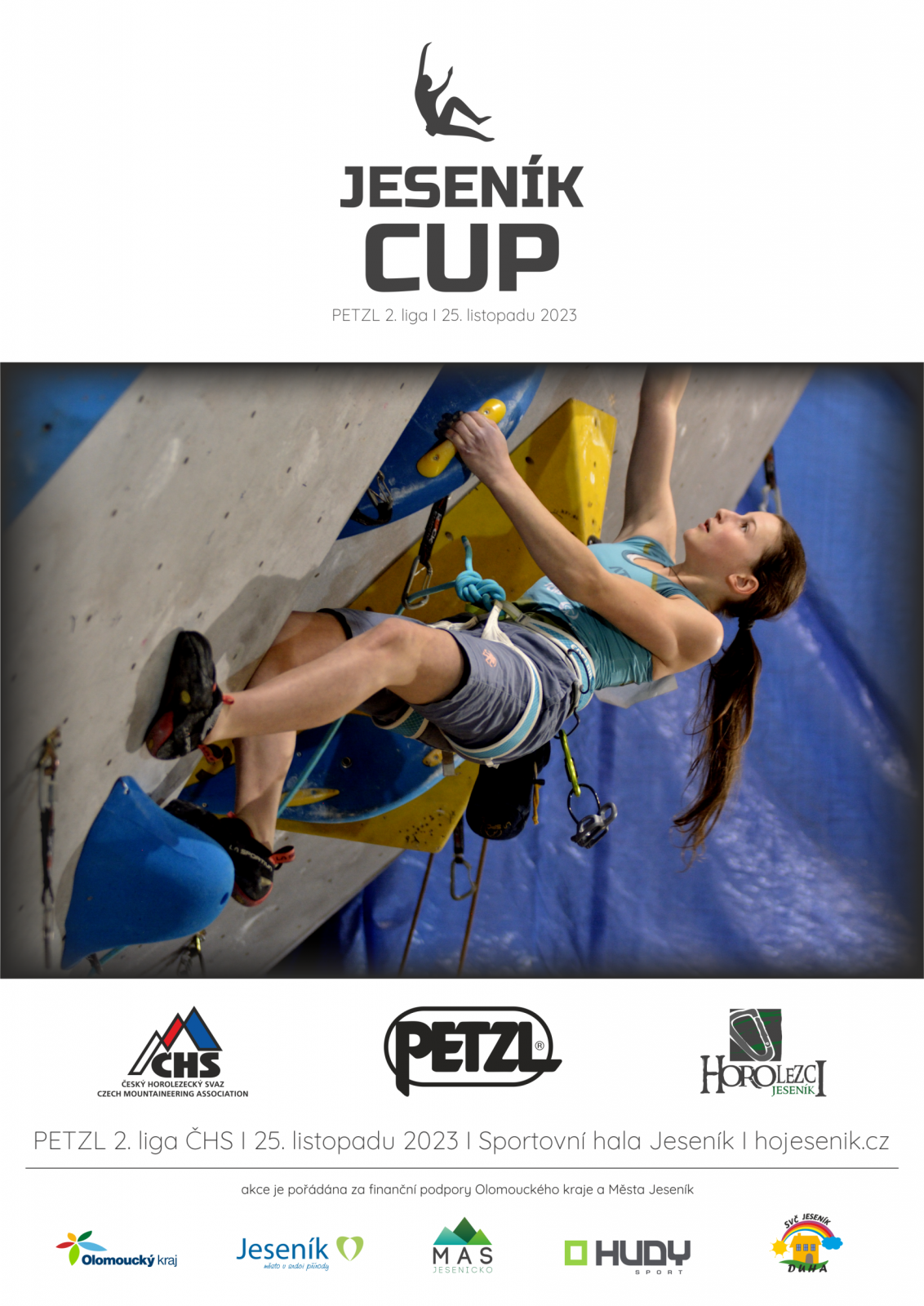 Jeseník CUP 2023 25.11.2023 - Závod proběhne jako finále 2. liga v lezení na obtížnost pod patronací Českého horolezeckého svazu a firmy PETZL. Termín konání: 25. listopadu 2023 (sobota) Předregistrace a platby: Startovnépro členy ČHS: Průběh závodu: Na konci závodu proběhne také vyhlášení vítězů celého seriálu PETZL 2. ligy ČHS. Hlavní rozhodčí: Adéla Zapletalová Ubytování: Je možno se domluvit na spaní v tělocvičně Gymnázia Jeseník za poplatek 100 Kč / osoba rezervujte předem na tel. +420 728 440 423 Závodů se nesmí účastnit závodníci, kteří: Závodníci, kteří jsou členy ČHS, musí mít u sebe při registraci platný průkaz ČHS s čitelným QR kódem. Závod probíhá dle platných pravidel soutěžního lezení a prováděcích předpisů pro závody dospělých/mládeže. Na závodě budou pořizovány fotografie a videa za účelem informování o závodě, které budou publikovány ve webových a tištěných médiích. Závodník registrací a účastí v závodě výslovně souhlasí s tím, aby ČHS popř. jeho smluvní partner pořizoval v souvislosti se závodem fotografie, audio nebo video záznamy závodníka, a tyto dále bezplatně využíval zejména jejich rozmnožováním, rozšiřováním nebo zveřejňováním. Ke stažení